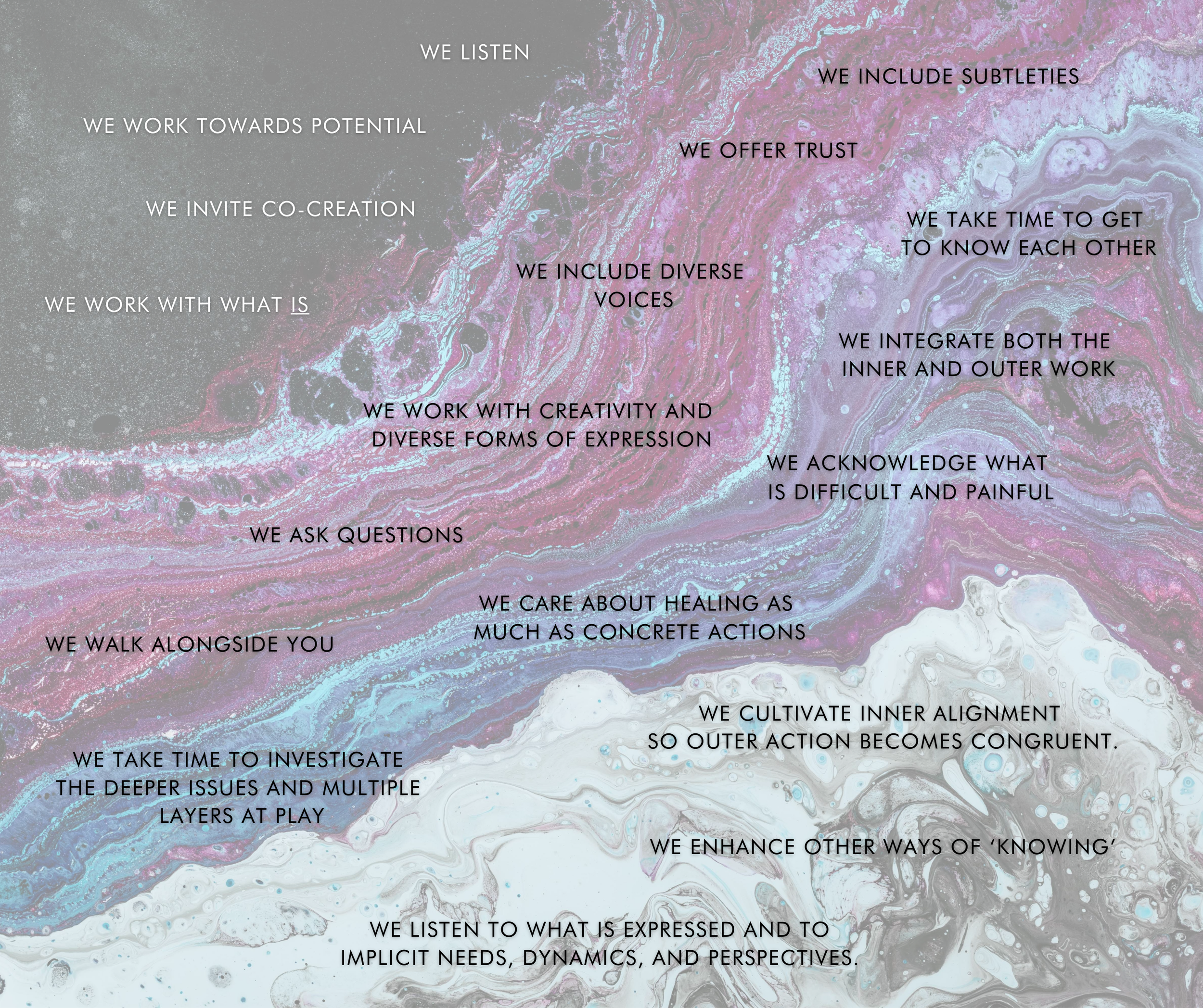 We view obstacles as teachers, engage with the generative power of the liminal spaces, and welcome inquiry from multiple perspectives.